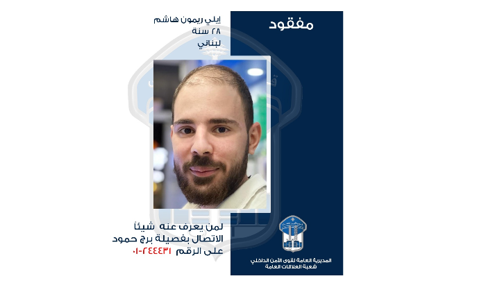 صدر عن المديرية العامة لقوى الأمن الداخلي - شعبة العلاقات العامة ما يلي: "تُعمِم المديرية العامة لقوى الأمن الداخلي بناءً على إشارة القضاء المختص صورة المفقود إيلي ريمون هاشم (مواليد عام 1995، لبناني)، الذي غادر منزله الكائن في برج حمود - شارع طومارزا حوالي الساعة 07،30 من تاريخ 11/09/2023، ولم يعد لغاية تاريخه.