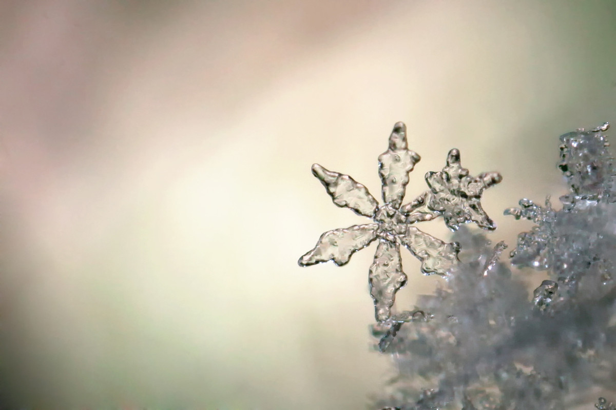 A snowflake starts as a tiny grain of dust or pollen floating in a cloud. Water vapor from the air sticks to the grain and freezes, forming into a tiny hexagonal crystal.