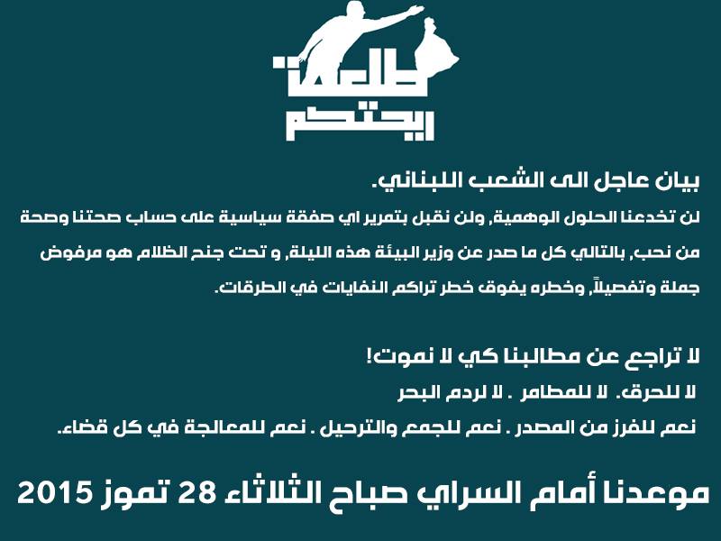 Civil society activists described the solution and method of collection as arbitrary and draconian, voicing their rejection to the agreement reached by the ministerial committee. A protest was held in Beirut's Riad El-Soleh’s Square to denounce the government's failure to resolve the pressing waste issue, in a sustainable, eco-friendly manner as the latter was set to held a cabinet session -which was deferred due to unknown reasons.
