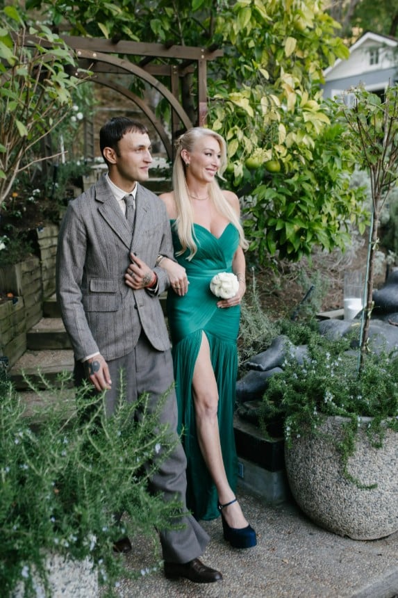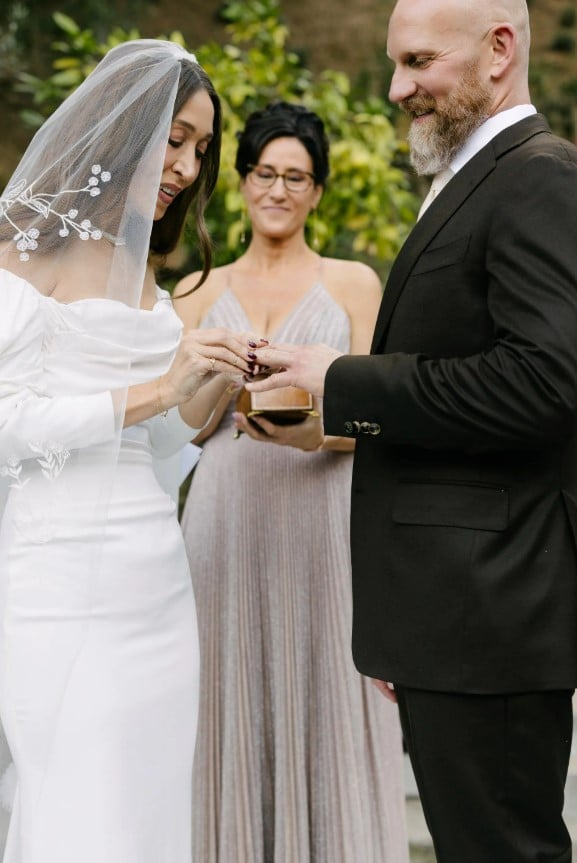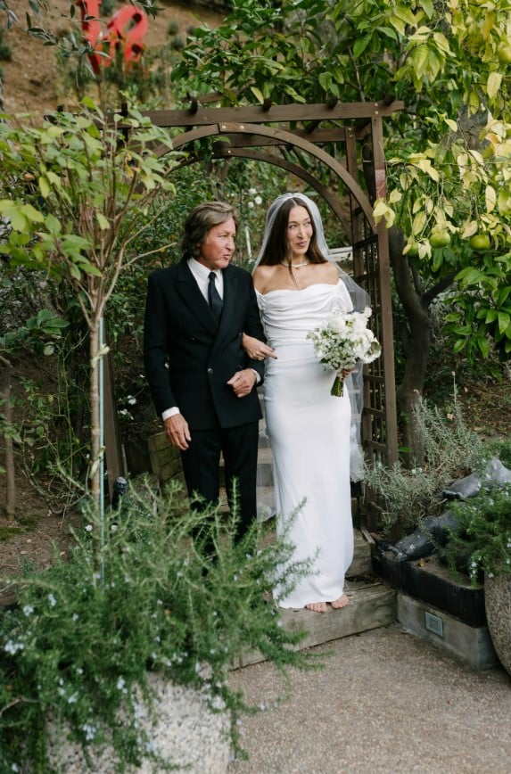 ووفقًا لما نقلته مجلة "بيبول" عن ممثلة العروس، اختارت ألانا فستانًا من تصميم فيفيان ويستوود بتصميم كلاسيكي فاخر، نسّقته مع مجوهرات من Dorsey وخاتم ذهبي خاص من Sofia Kaman.