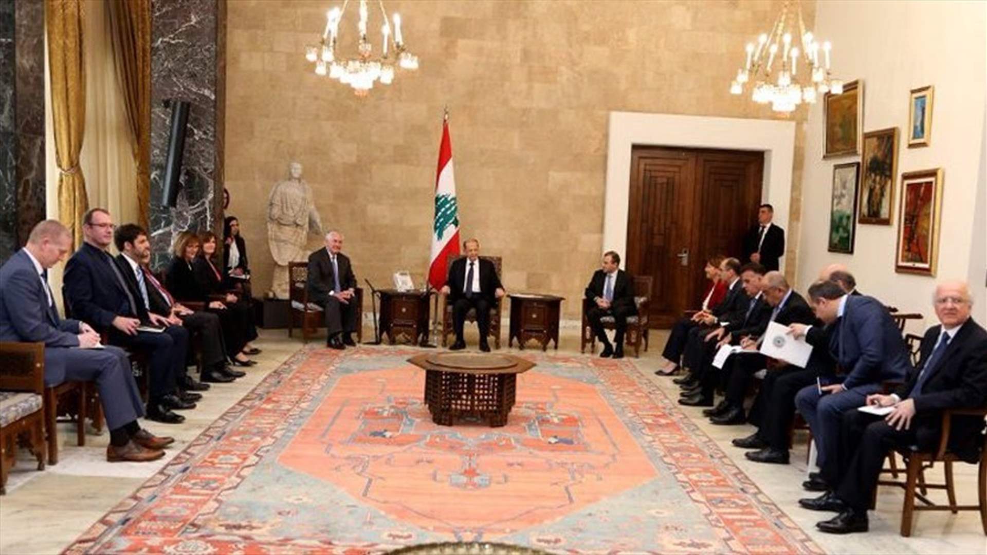 US Secretary of State Rex Tillerson arrived in Lebanon on Thursday morning, and headed to Baabda presidential palace where he held talks with President Michel Aoun, in the presence of Foreign Minister Gebran Bassil and Director General of General Security Maj. Gen. Abbas Ibrahim and a number of advisors.