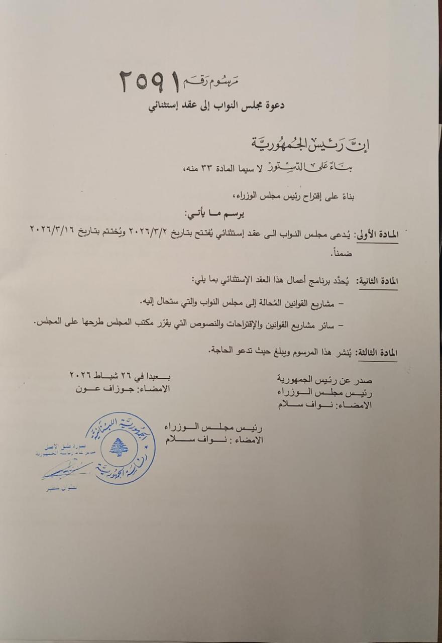 وقّع رئيس الجمهورية العماد جوزاف عون ورئيس الحكومة نواف سلام مرسوما يقضي بدعوة مجلس النواب الى عقد استثنائي يفتتح بتاريخ 2-3-2026 ويختتم بتاريخ 16-3-2026 ضمنا.