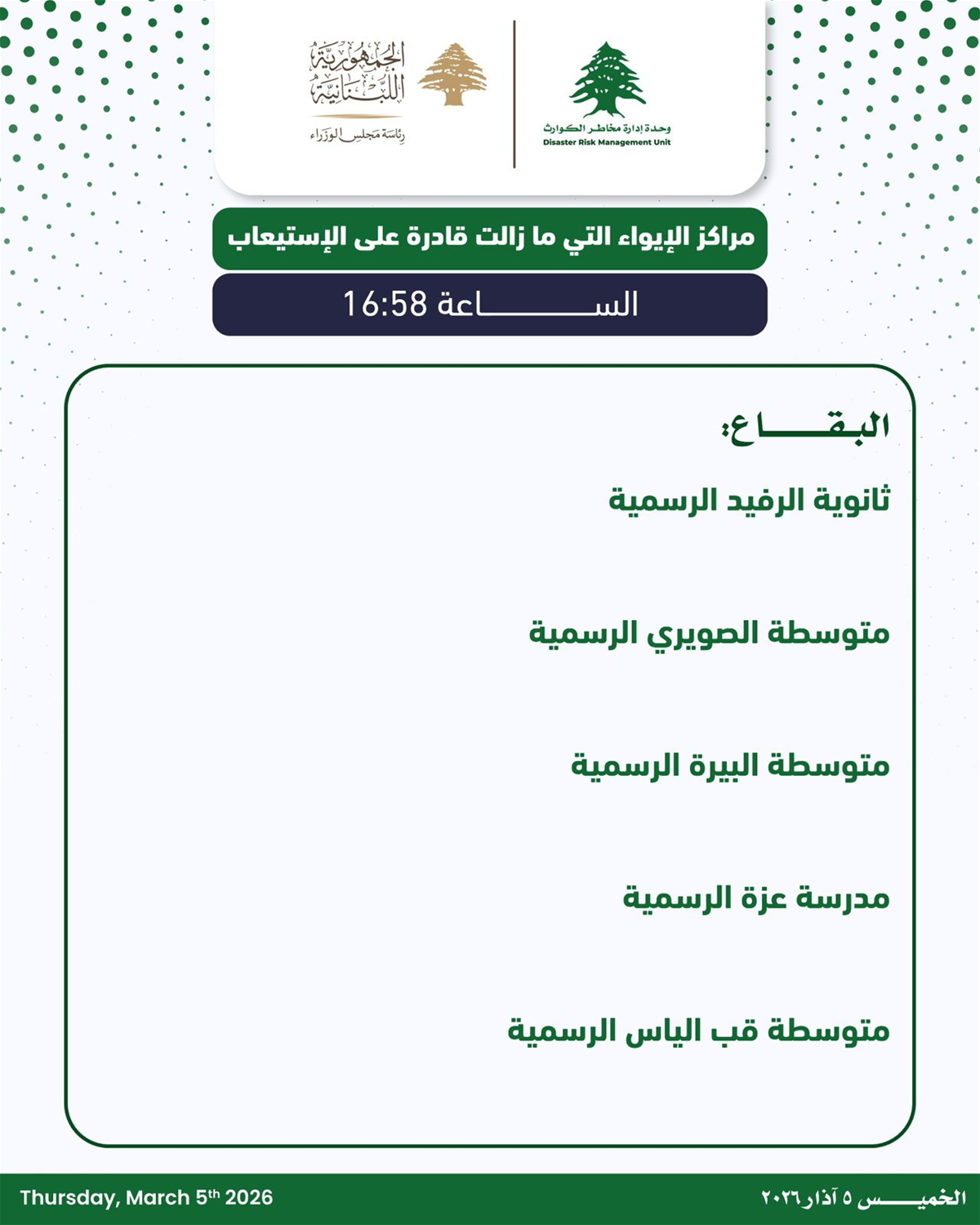 بالصور - وحدة إدارة الكوارث تعمّم مراكز الإيواء التي ما زالت قادرة الإستيعاب في الشمال وعكار والبقاع
