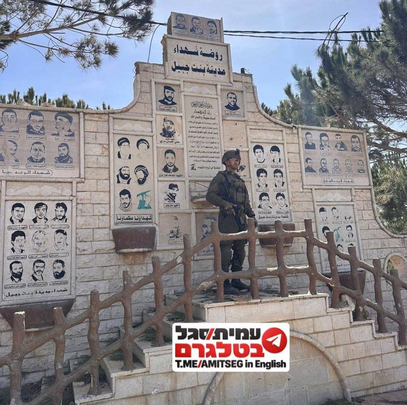 صورة لقائد لواء غيفعاتي الإسرائيلي من بنت جبيل بالقرب من جدار تذكاري لشهداء حزب الله