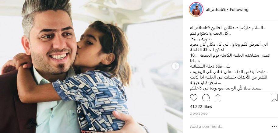 View this post on Instagram شكرا جزيلا للفنانة الامارتية الكبيرة احلام وايضا شكرا للفنانة العراقية الكبيرة الاء حسين على هذا الكلام جميل ممتن من حضراتكم .. وانا عد وعدي ونظرت حياتي لبلدي لا بد ان نصحح اذا كلنا تعاونا ورفضنا واقعنا المرير . خلينا كلنا نكون صوت واحد لا للظلم لا للاطهاد لا للعبوديه فلتحيا الطفولة والأنسانية ... #علي_عذاب A post shared by علي عذاب - Ali Athab (@ali_athab9) on Oct 13, 2018 at 3:18am PDT