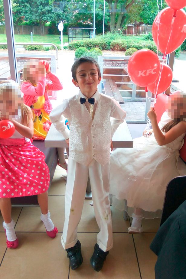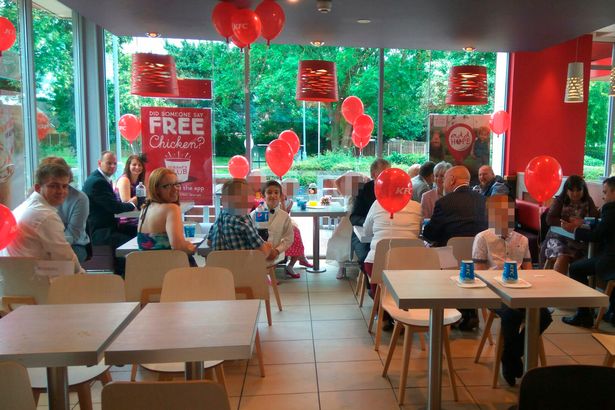 إشارة الى أن المطعم كان محجوزاً بالكامل للحفل وكانت الزينة مصنوعة من بالونات KFC الحمراء اللون مع المناديل والكؤوس والأطباق.