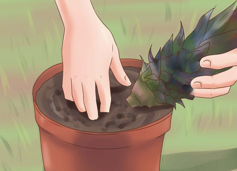 9- ازرعوا تاج ثمرة الأناناس في وعاء. قوموا بزراعة التاج عندما تكون الجذور طويلة بضع سنتميترات. انتظروا حتى تصبح طويلة بما يكفي لتترسخ في التربة.