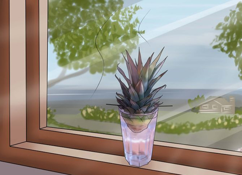 6- ضعوا تاج ثمرة الأناناس في الماء. ينبغي أن تُغمر الساق في الماء، وتمتد الأوراق لأعلى.