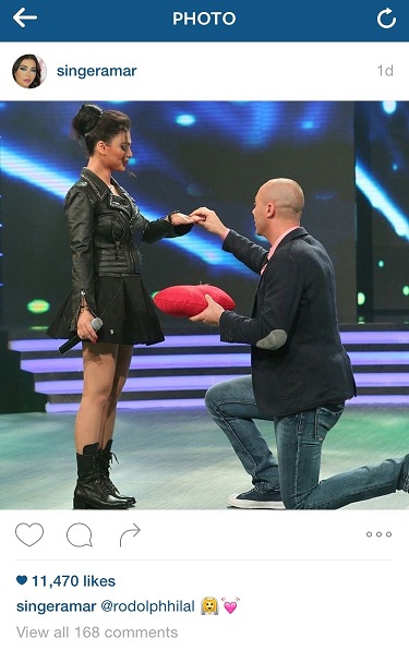 في التفاصيل، فاجأت قمر متابعيها على موقع التواصل الاجتماعي انستغرام بنشر صورٍ جديدة يظهر فيها رودولف جاثياً على قدمه لتقديم خاتم الخطوبة على قلبٍ أحمر. أمّا في الصورة الثانية، فعانقت قمر خطيبها برومنسية. وأرفقت الفنانة الصورتين بتعليق اقتصر على قلب وقبلة.