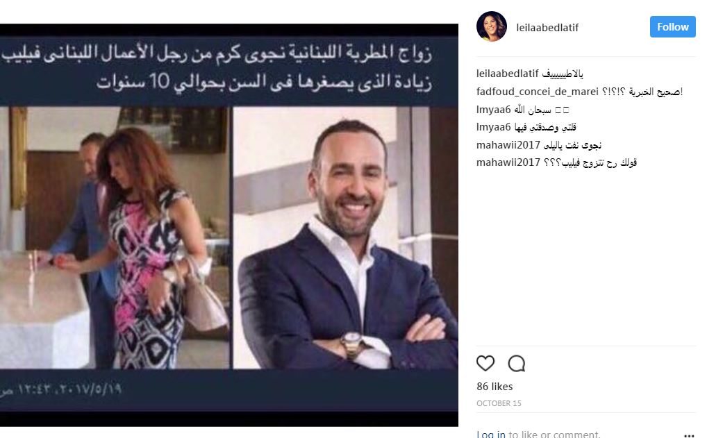 وكانت ليلى عبداللطيف من بين مَن تداول الخبر الّذي تبيّن أنه شائعة، فنشرت عبر إنستغرام "صورة زواج نجوى كرم" وارفقتها بعبارة "يا لطيف".