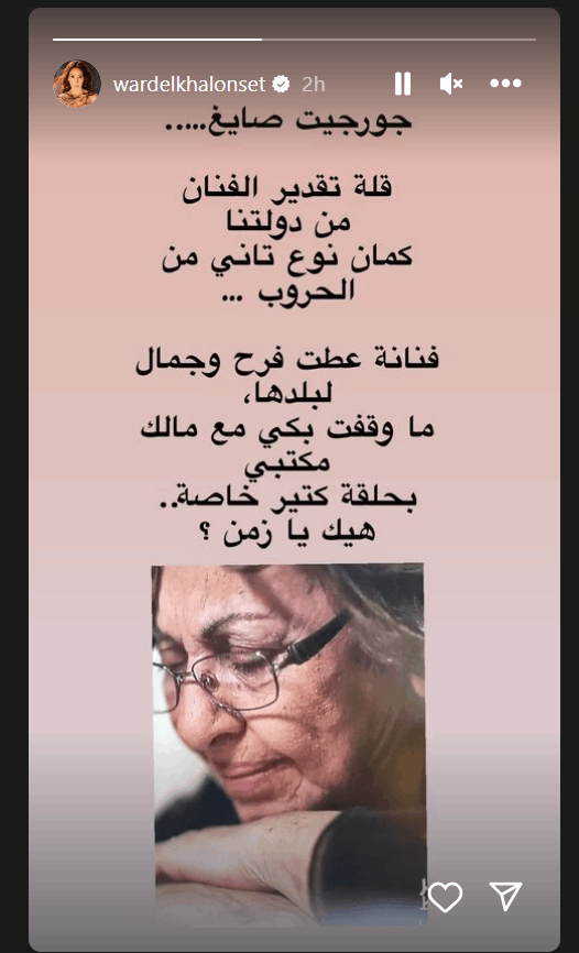 وكتبت ورد الخال في خاصية القصص عبر انستغرام: "جورجيت صايغ.... قلة تقدير الفنان من دولتنا كمان نوع تاني من الحروب... فنانة عطت فرح وجمال لبلدها، ما وقفت بكي مع مالك مكتبي بحلقة كثير خاصة... هيك يا زمن؟".