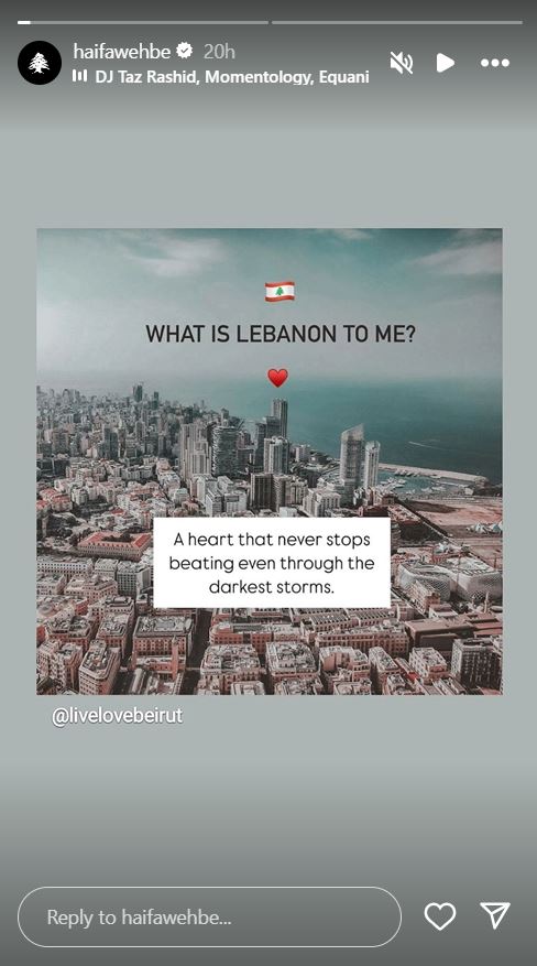 ونشرت وهبي صورة عبر خاصية القصص المصورة على انستغرام أظهرت العاصمة اللبنانية بيروت والتي تضمنت المقطع التالي: "ما هو لبنان بالنسبة لي؟ قلب لا يتوقف عن الخفقان حتى في أحلك العواصف".