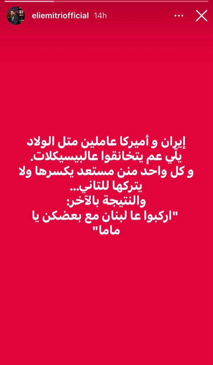 كتب الممثل اللبناني ايلي متري رسالة عبر خاصية الستوري على منصة انستغرام، تحدث فيها عما تقوم به كل من ايران وأميركا والنتائج المترتبة على لبنان.