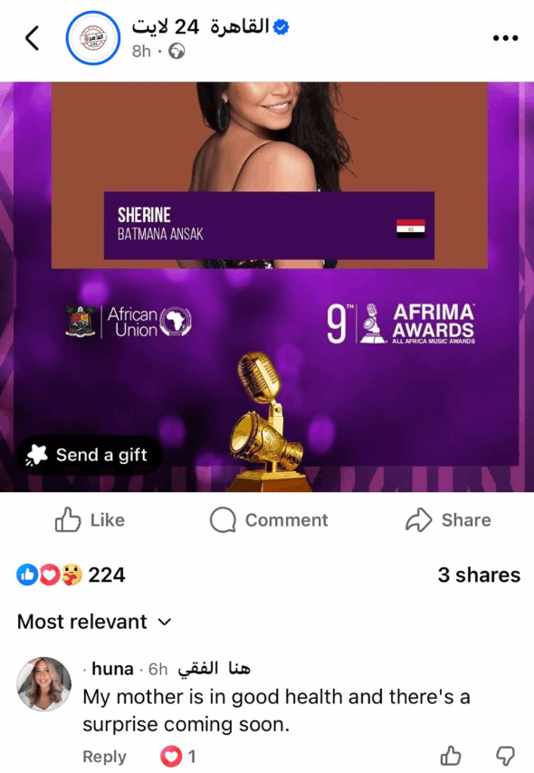 وجاء تعليق ابنة شيرين بعد إعلان فوز والدتها بـجائزة أفريما العالمية (AFRIMA) كـأفضل فنانة في شمال إفريقيا عن ألبومها الأخير "بتمنى أنساك"، والذي حقق تفاعلاً واسعًا ونسب استماع مرتفعة عبر مختلف المنصات، إلى جانب تصدره تريند مواقع التواصل الاجتماعي.