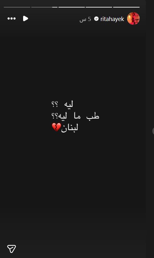 أعربت الممثلة اللبنانية ريتا حايك عن حزنها الشديد جرّاء المأساة التي يعيشها الشعب اللبناني حالياً بعد تجدد العدوان الإسرائيلي على لبنان.