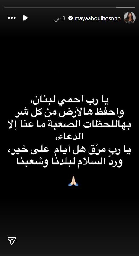 وكتبت مايا أبو الحسن عبر خاصية القصص المصورة على انستغرام: "يا رب احمي لبنان، واحفظ هالأرض من كل شر بهاللحظات الصعبة ما عنا إلا الدعاء، يا رب مرّق هالأيام على خير، وردّ السلام لبلدنا وشعبنا".