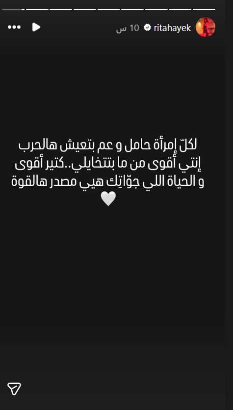 وكتبت ريتا حايك عبر خاصية القصص المصورة على انستغرام: "لكلّ امرأة حامل وعم بتعيش هالحرب أنت أقوى من ما بتتخايلي... كتير أقوى والحياة اللي جواتك هي مصدر هالقوة".
