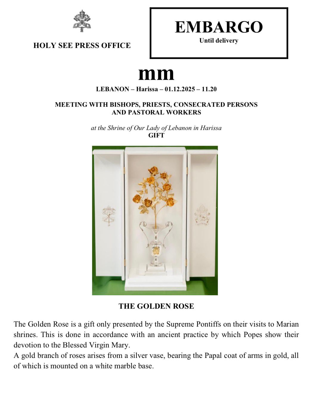 أما في حريصا، وخلال لقائه بالأساقفة والمكرّسين، قدّم البابا هدية ذات دلالة تاريخية: الوردة الذهبية، وهي تقليد بابوي قديم يقدّم للعتبات المريمية الكبرى فقط.