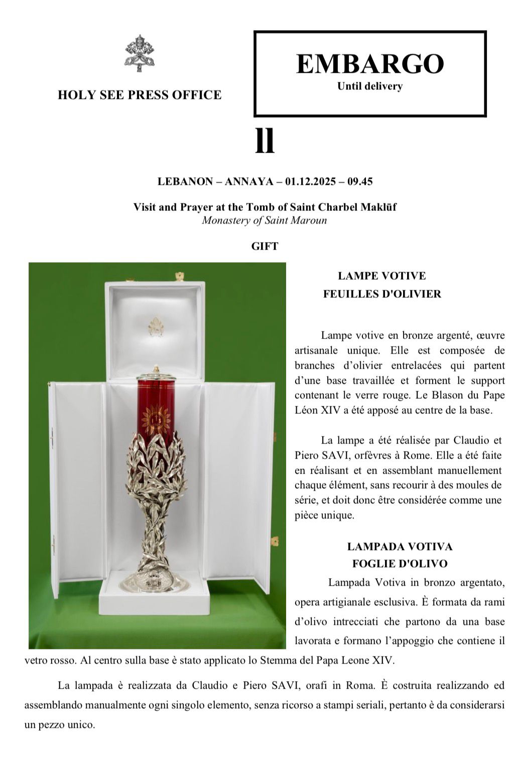 ,في عنايا، عند ضريح القديس شربل، قدّم البابا مصباحاً وقفياً مصنوعاً من البرونز المفضّض، صُمّم يدوياً من قبل الحرفيَّيْن الإيطاليَّيْن كلاوديو وبيرو سافي في روما.