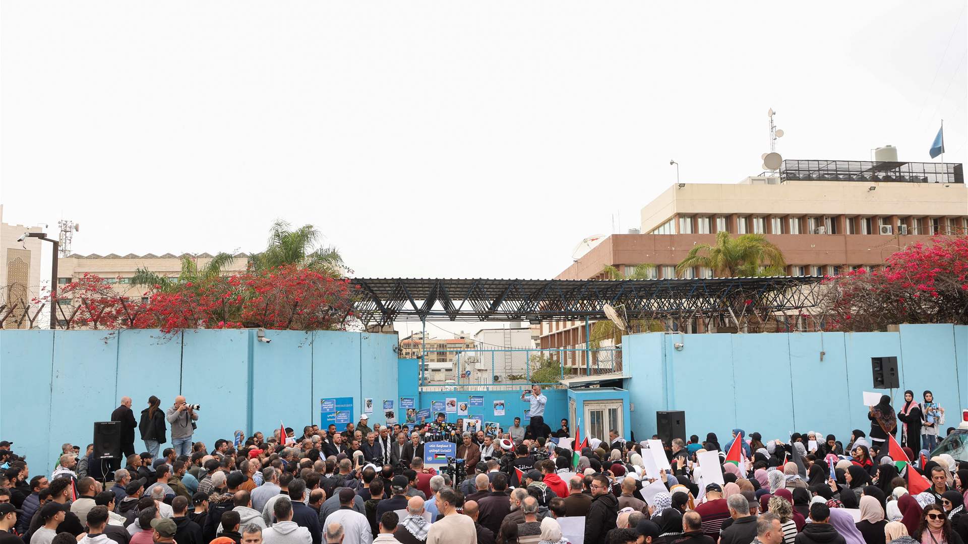 Dozens of people protested outside the Beirut office of the United Nations Palestinian Refugee Agency on Wednesday after it put a staff member on administrative leave over possible violations of staff conduct regulations.