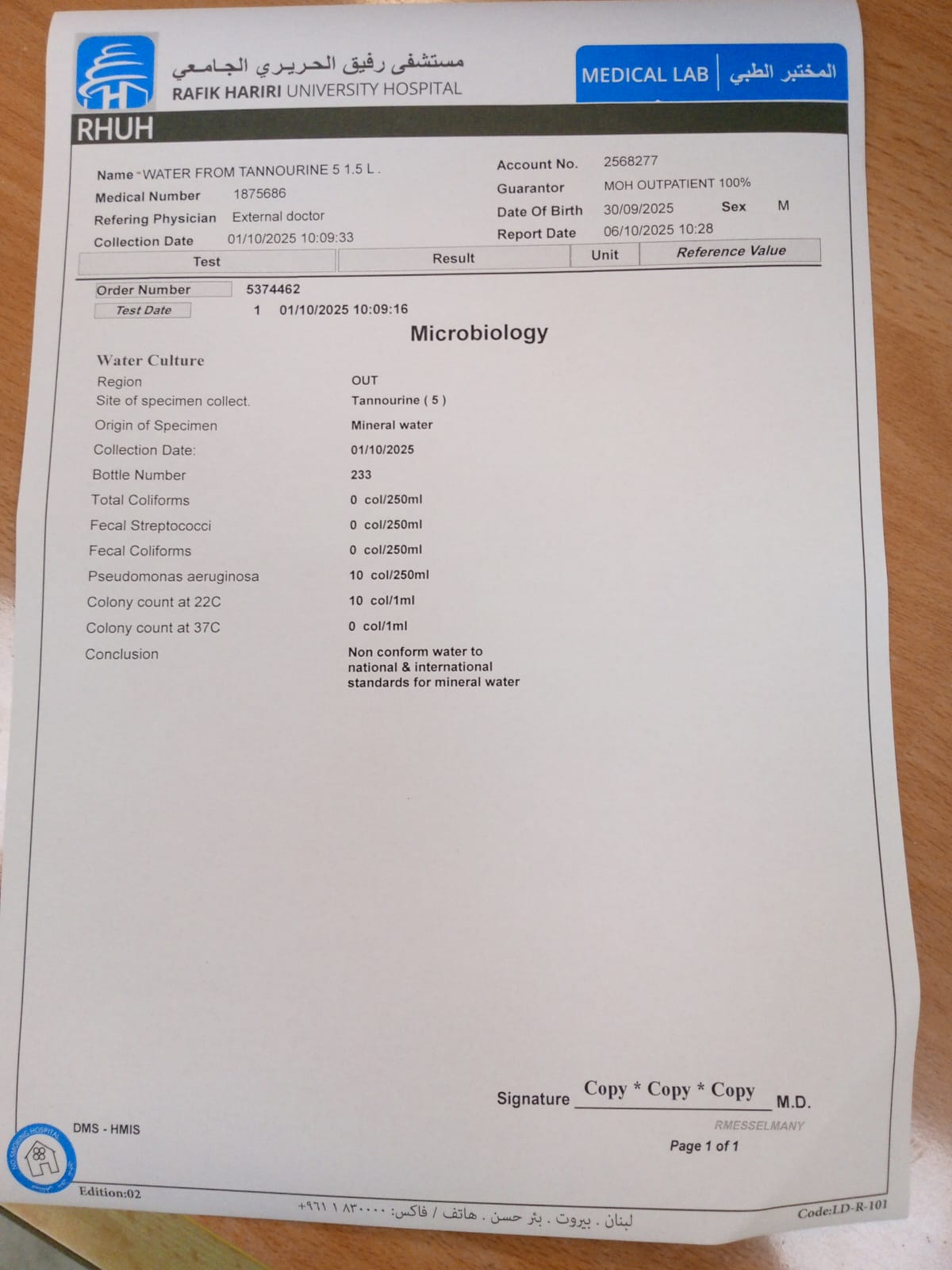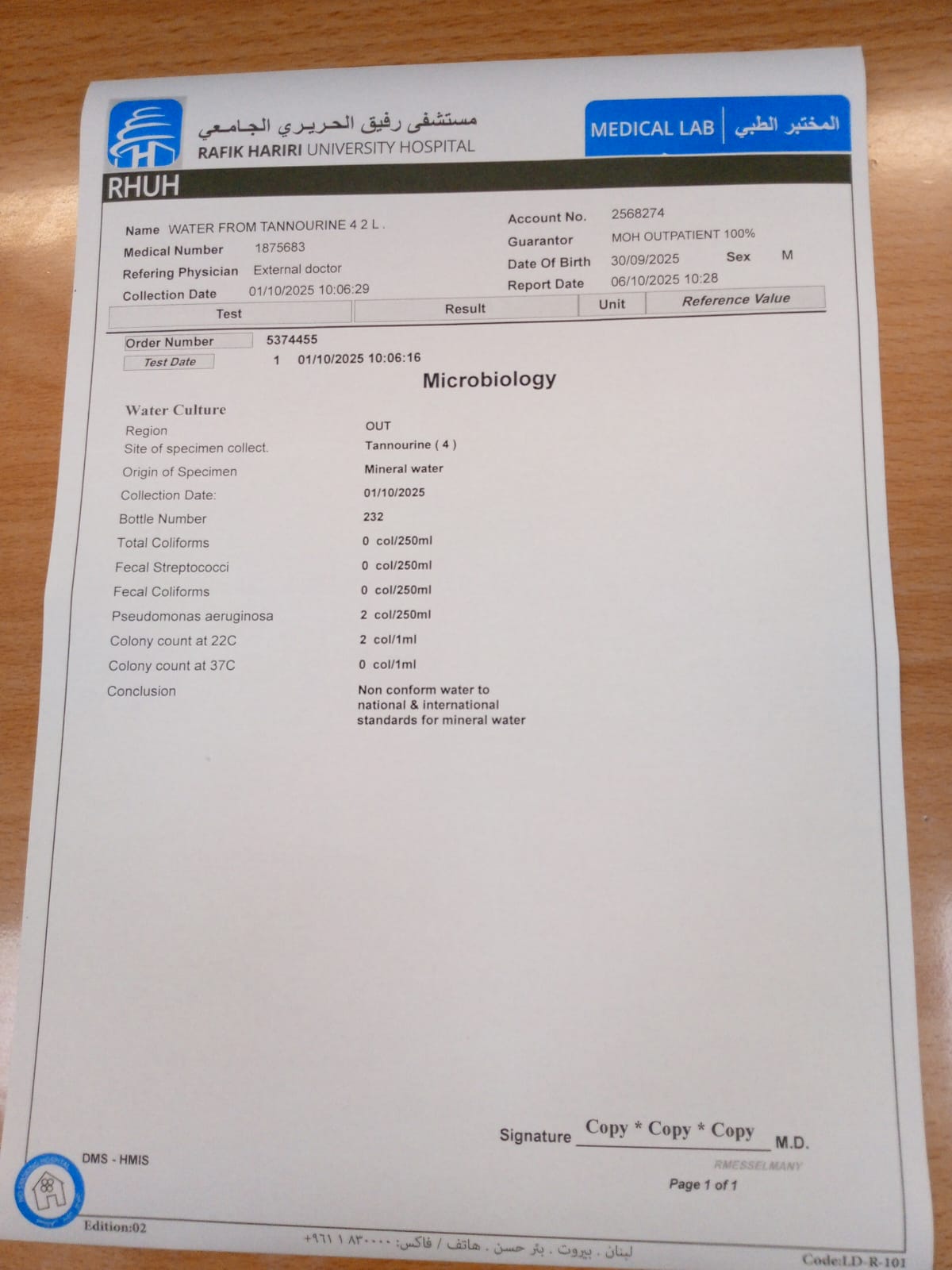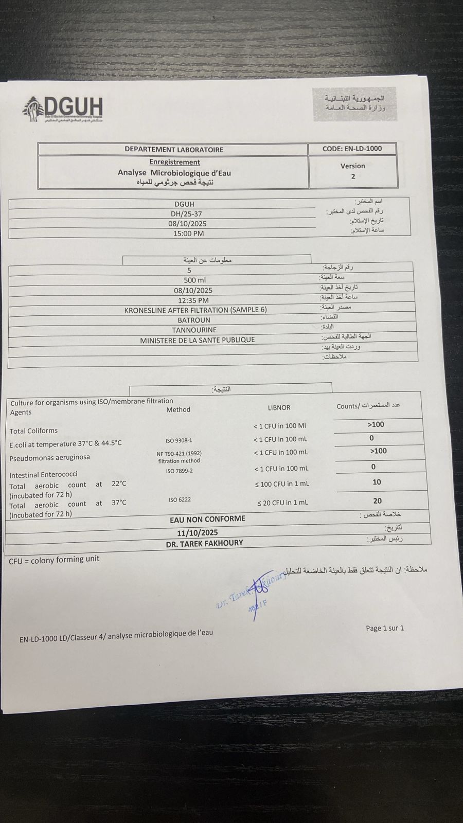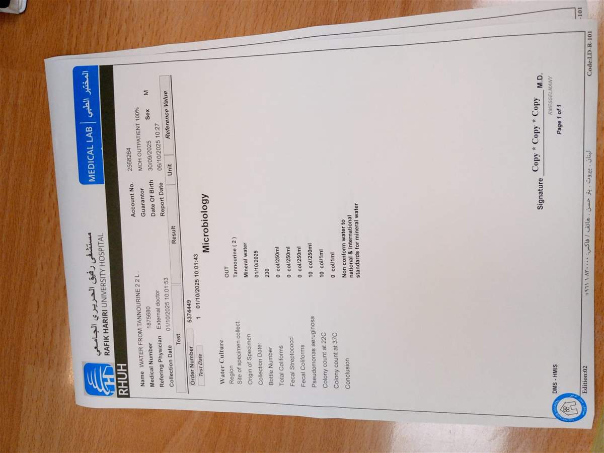 After the Ministry of Health issued a decision to halt operations at Tanourine Water Company and withdraw its products due to contamination, laboratory test results attached below confirmed the presence of pollutants in the water.
