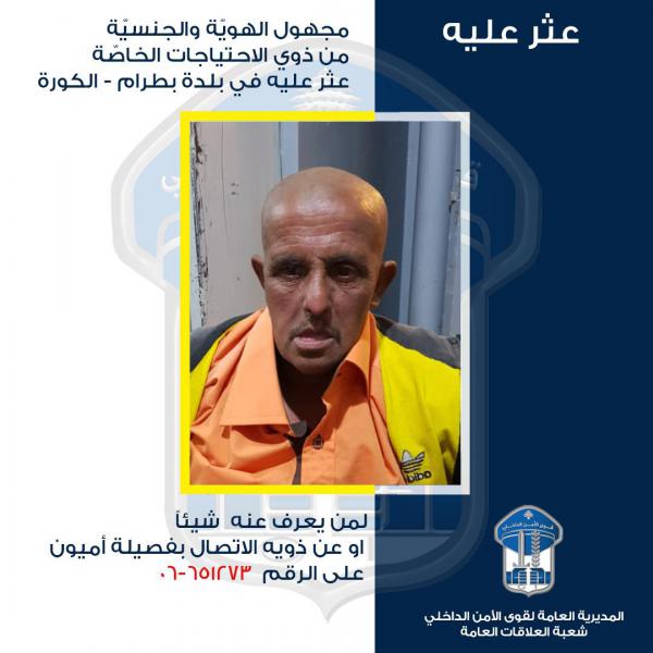 عمّمت المديرية العامة لقوى الأمن الداخلي، بناءً على إشارة القضاء المختص صورة مفقود في العقد الرابع من العمر، عثر عليه بتاريخ 9/4/2022 في بلدة بطرام - الكورة، وليس بحوزته أي مستند يُعرّف عنه، وهو من ذوي الاحتياجات الخاصة ويعاني من صعوبة في النطق.
