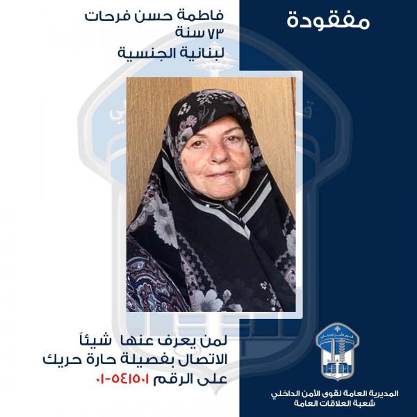 عممت المديريّة العامّة لقوى الأمن الدّاخلي بناءً على إشارة القضاء المختص، صورة المفقودة: فاطمة حسن فرحات (مواليد عام 1950، لبنانيّة).
