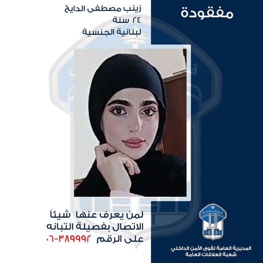 عمّمت المديريّة العامّة لقوى الأمن الداخلي، بناءً على إشارة القضاء المختص، صورة المفقودة زينب مصطفى الدايخ (من مواليد عام 2000، لبنانيّة) التي غادرت بتاريخ 30-10-2024، منزلها الكائن في محلّة التبانة، ولم تَعُد لغاية تاريخه.