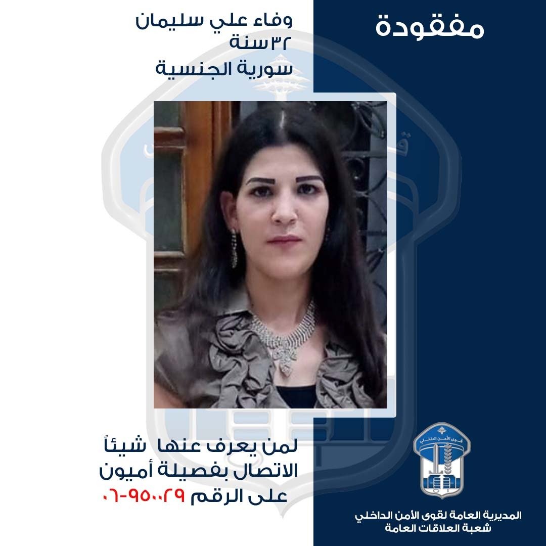 عمّمت المديرية العامة لقوى الأمن الداخلي، بناءً على إشارة القضاء المختص، صورة السيّدة: وفاء علي سليمان (من مواليد عام 1993، سوريّة) التي غادرت، بتاريخ 6-10-2025، منزلها الزوجي الكائن في بلدة متريت - قضاء الكورة، ولم تَعُد لغاية تاريخه.