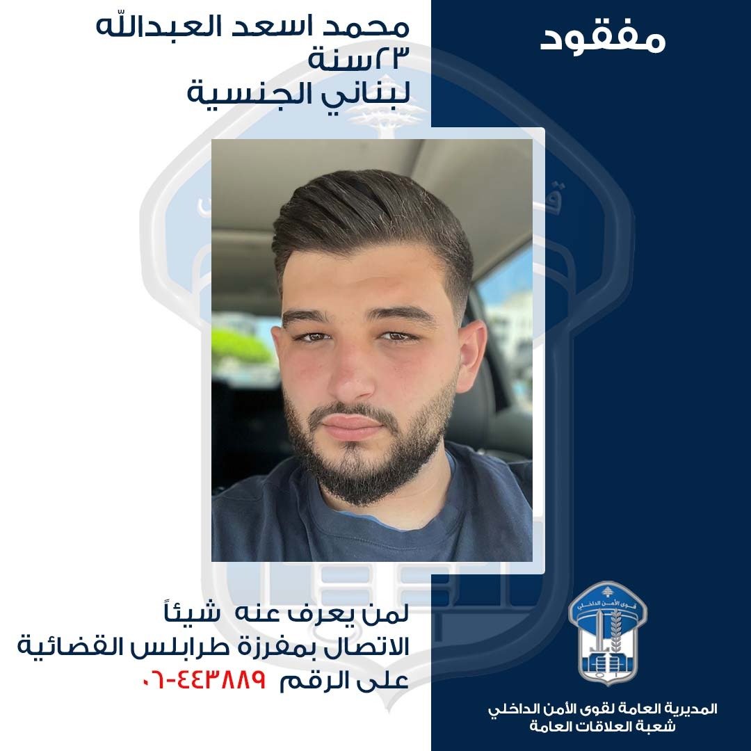عمّمت المديرية العامة لقوى الأمن الدّاخلي، بناءً على إشارة القضاء المختص، صورة المفقود: محمد أسعد العبد الله (من مواليد عام 2002، لبناني) الذي غادر بتاريخ 13-10-2025، من محلّة طرابلس، ولم يَعُد لغاية تاريخه.
