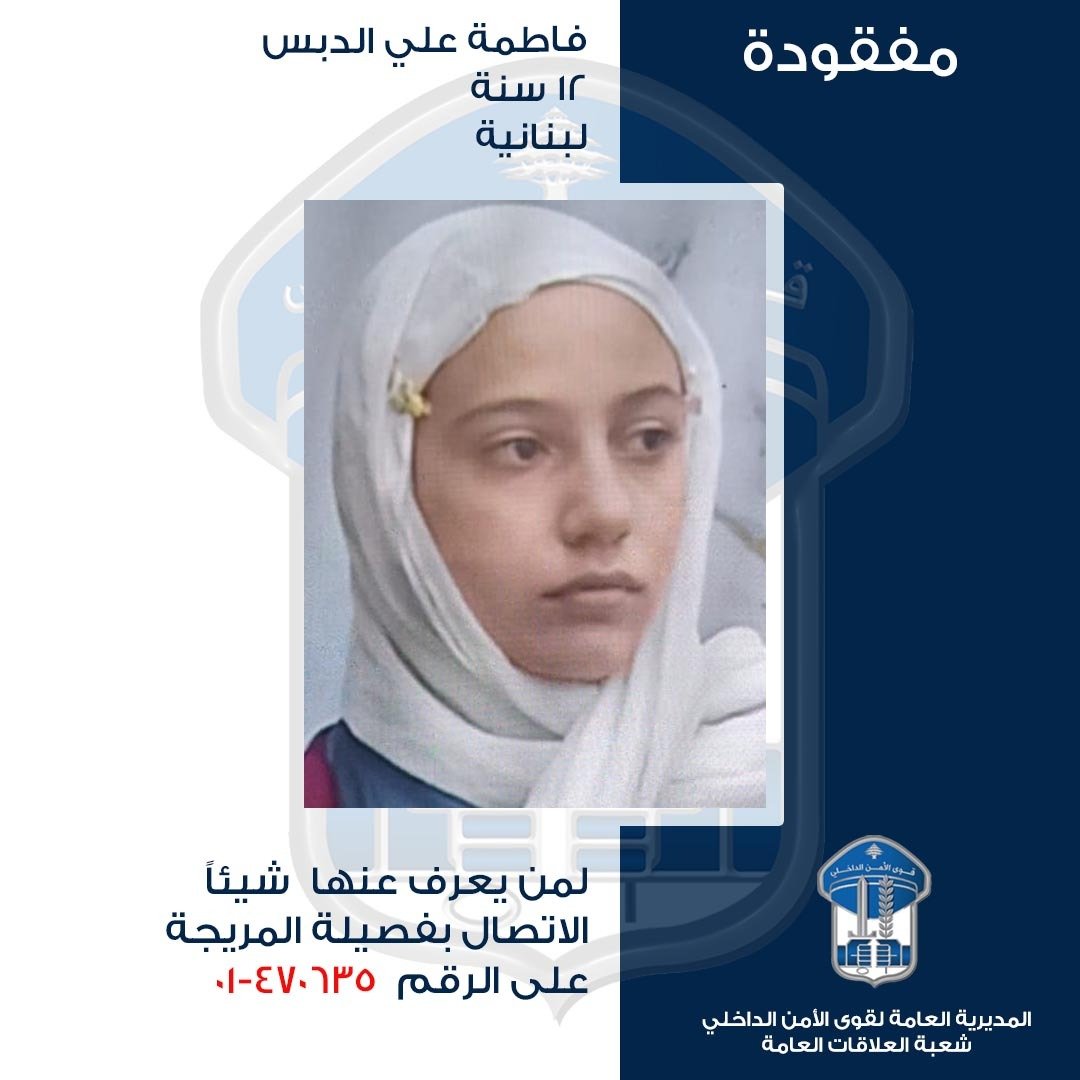 عمّمت المديرية العامة لقوى الأمن الداخلي، بناءً على إشارة القضاء المختص، صورة القاصر المفقودة: فاطمة علي الدبس (مواليد عام 2013، لبنانيّة) التي غادرت، بتاريخ 27-11-2025، منزلها الكائن في محلّة عين الدّلبة – الضّاحية الجنوبيّة، إلى جهةٍ مجهولة، ولم تَعُد حتى تاريخه.