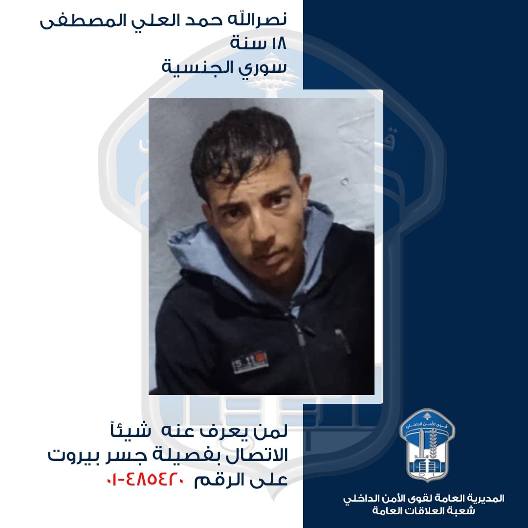 عمّمت المديرية العامة لقوى الأمن الداخلي بناءً على إشارة القضاء المختص، صورة المفقود نصرالله حمد العلي المصطفى (مواليد عام 2007، سوري) الذي غادر حوالي السّاعة 21،00 من تاريخ 24-12-2025 محلّة النبعة - شارع الغيلان إلى جهة مجهولة ولم يَعُد لغاية تاريخه، علمًا أنّه يعاني من اضطّرابات نفسيّة.