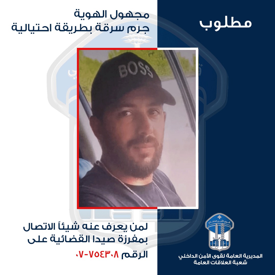 لذلك، وبناءً على إشارة القضاء المختص، طلبت المديرية العامة لقوى الأمن الداخلي من الذين يعرفون شيئًا عنه أو عن مكان وجوده، التّوجه إلى المفرزة المذكورة، الكائنة في حارة صيدا - تلة مار إلياس، أو الاتّصال على أحد الرقمين: 754308-07 أو 729147-07، للإدلاء بما لديهم من معلومات. علمًا بأن كل من يُسهِم في إعطاء أي معلومة يبقى اسمه طي الكتمان، وفقًا للقانون.