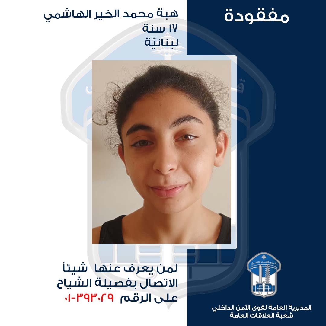 عمّمت المديرية العامة لقوى الأمن الدّاخلي، بناءً على إشارة القضاء المختص، صورة القاصر المدعوة: هبة محمد الخير الهاشمي (مواليد عام 2008، لبنانية) التي فُقدت بتاريخ 2-3-2026 أثناء انتقالها من منطقة عين الرمانة باتجاه ساقية الجنزير.
