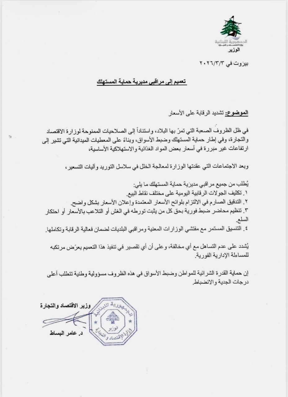 وشدّد التعميم على تكثيف الجولات الرقابية على نقاط البيع، والتشدّد في التحقق من الالتزام بلوائح الأسعار وإعلانها بوضوح، وتنظيم محاضر ضبط فورية بحق كل مخالف، بالتنسيق الكامل مع الجهات المعنية لضمان فعالية الإجراءات وتسريع الملاحقات.