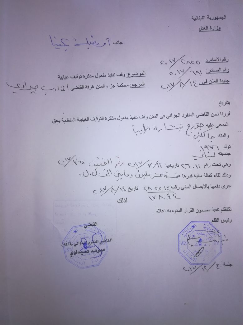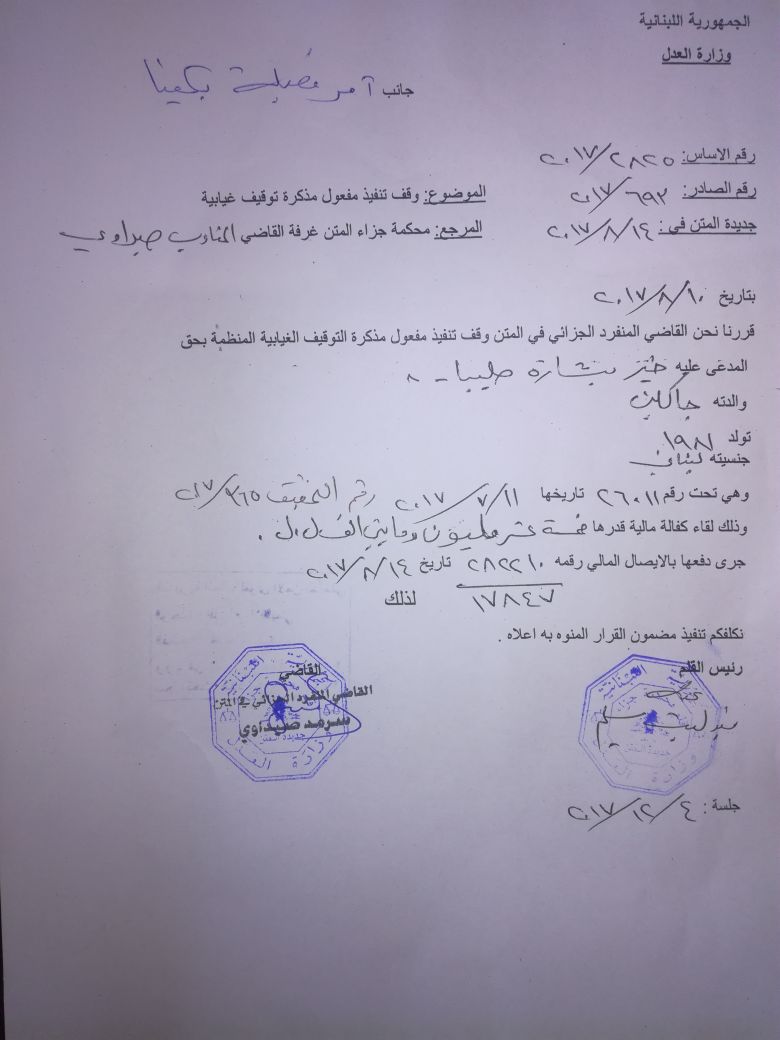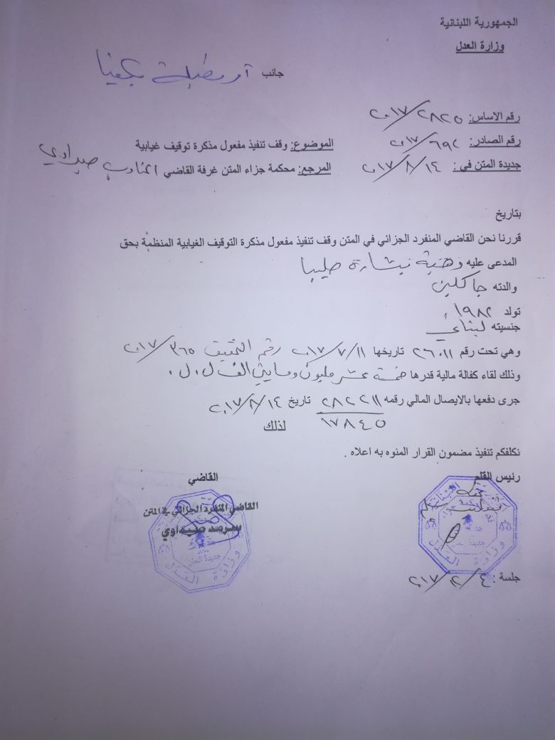 بعد حادثة الاعتداء على مستشفى بحنس اثر اطلاق النار في زفاف بتغرين واصابة المصور من آل مجاعص، قرر القاضي المنفرد الجزائي في المتن وقف تنفيذ مفعول مذكرة التوقيف الغيابية المنظمة بحق كل من خير بشارة صليبا، جورج بشارة صليبا ووهبة بشارة صليبا، وذلك لقاء كفالة مالية.