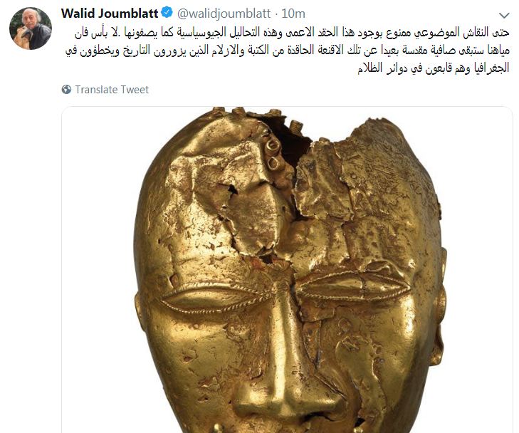 غرّد رئيس الحزب التقدمي الاشتراكي وليد جنبلاط على حسابه عبر تويتر قائلاً: "حتى النقاش الموضوعي ممنوع بوجود هذا الحقد الاعمى وهذه التحاليل الجيوسياسية كما يصفونها".