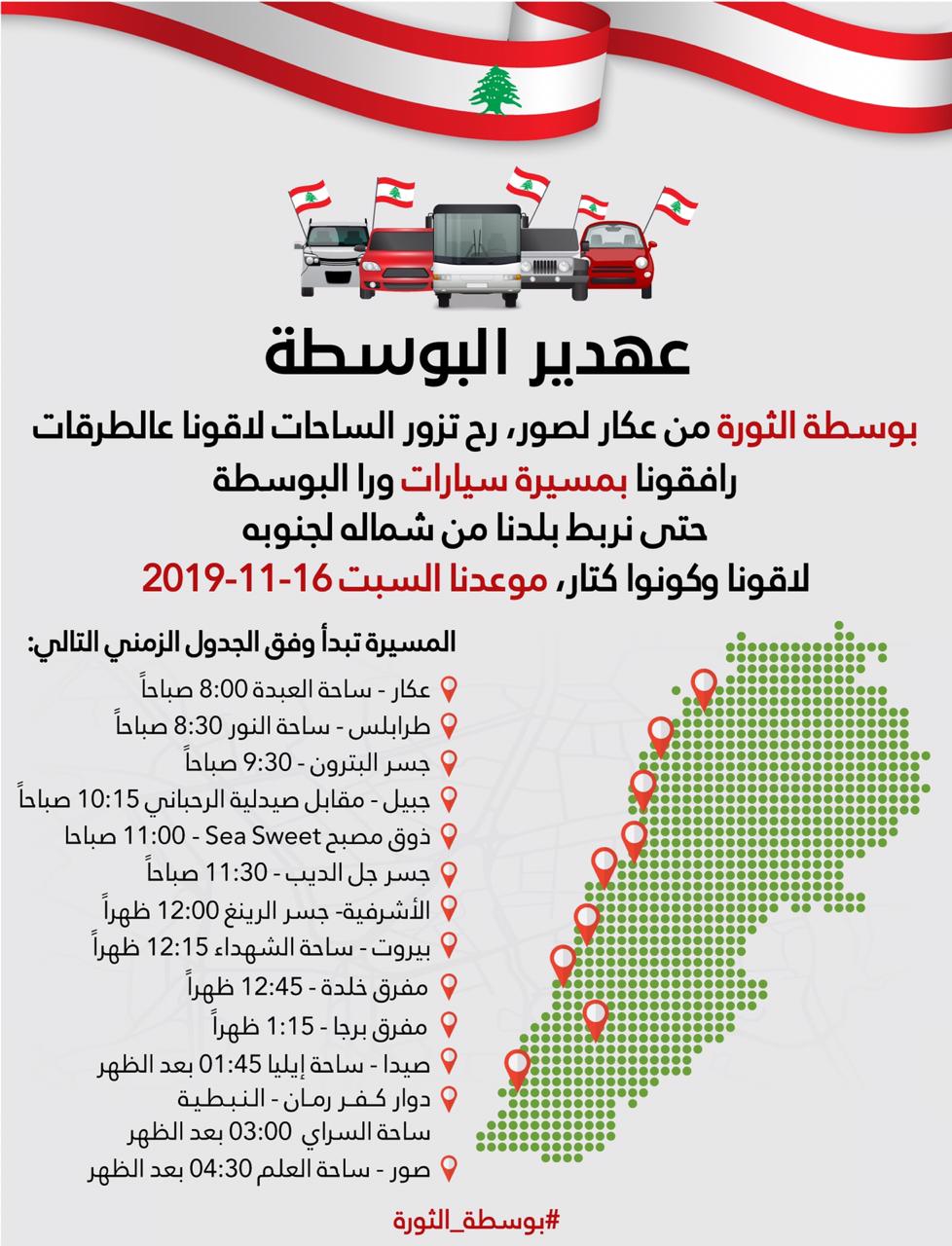 ينظم ملتقى مؤسسات المجتمع المدني في عكار الذي يمثل اكثر من ٦٠ جمعية رحلة لبوسطة تحمل اسم "بوسطة الثورة"، تنطلق يوم السبت ١٦ تشرين الثاني من حلبا في اتجاه ساحات الاعتصام على كامل الأراضي اللبنانية؛ حيث تتوقف خلال مسيرتها في كل ساحة ومحطة لتشارك الثوار صرختهم ونضالهم.