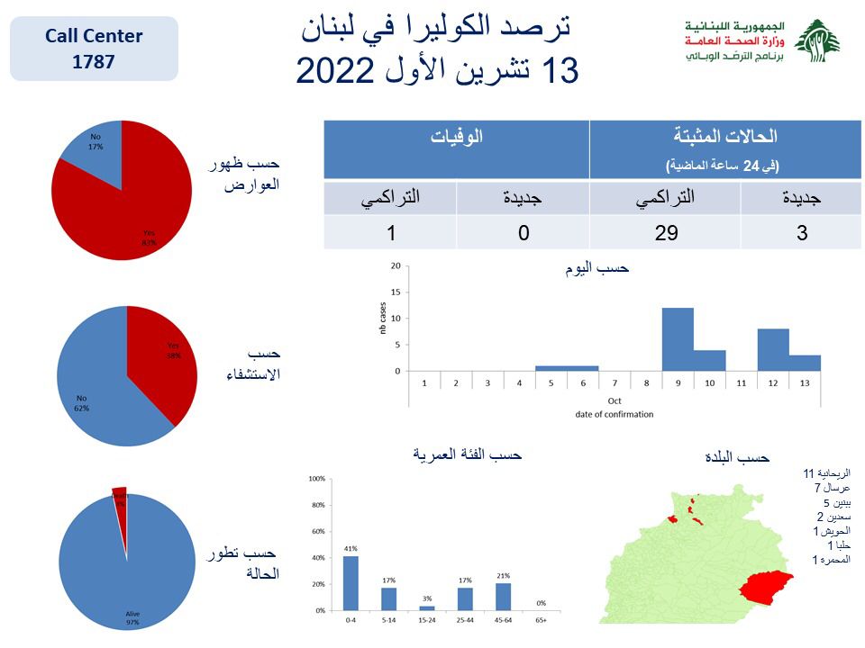 في ملف الكوليرا، أعلنت مصادر وزارة الصحة للـLBCI عن تسجيل ٣ حالات كوليرا جديدة ليصبح عدد الاصابات التراكمي ٢٩.