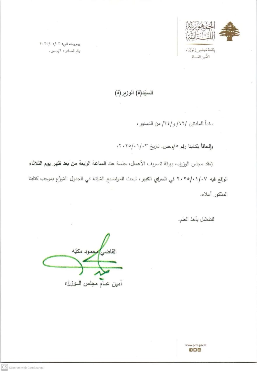 يعقد مجلس الوزراء بهيئة تصريف الأعمال، جلسة الساعة الرابعة من بعد ظهر يوم الثلاثاء في 7/1/2025 في السراي الكبير.