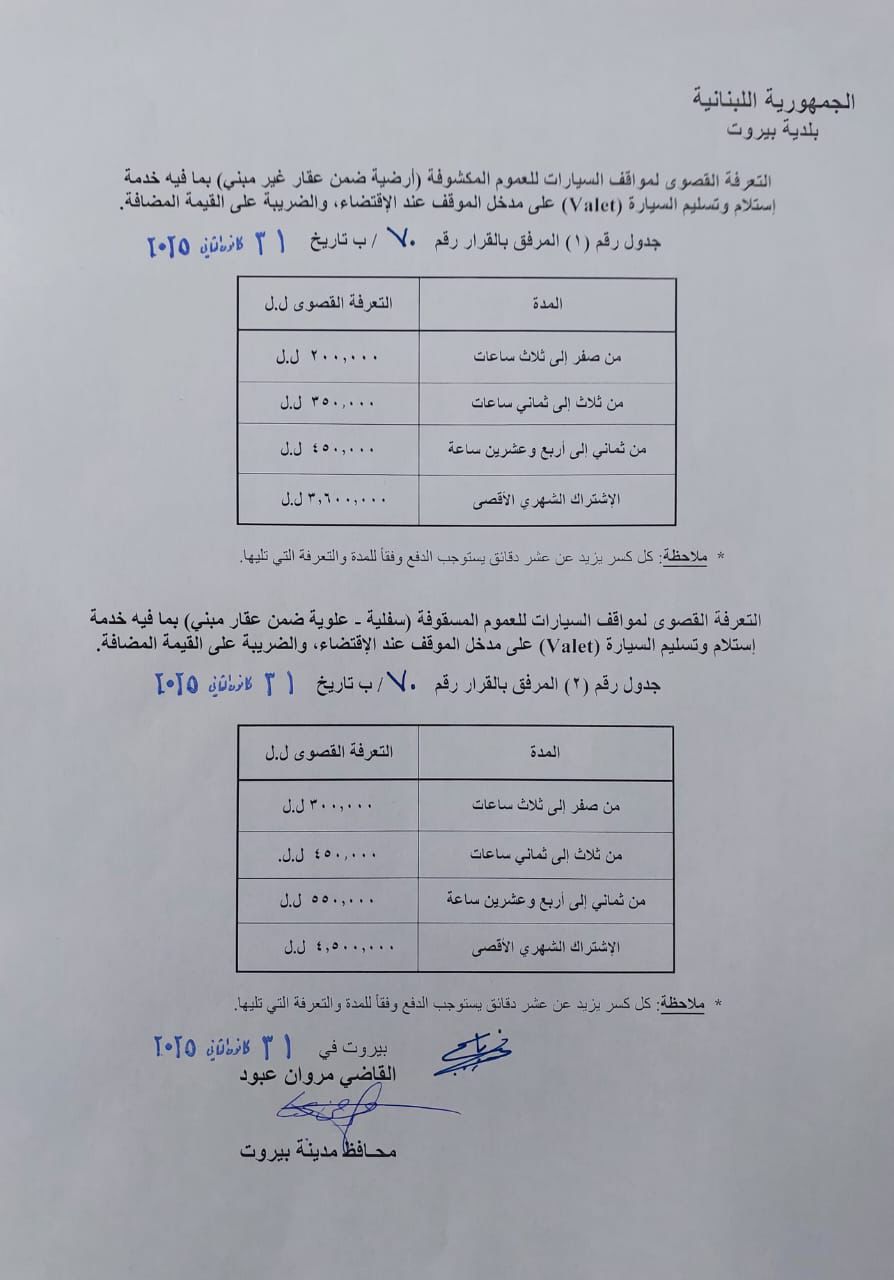 تُعدّل التعرفة القصوى لمواقـف السيارات للعموم في محافظة مدينة بيروت وتصبح وفـق ما هو محدد في الجدولين رقم (1) و(2) المرفقين بهذا القرار، بحسب طبيعة الموقف مكشوف (أرضي ضمن عقار غير مبني) أو مـسقـوف (سفلي - علوي ضمن عقار مبني)، والمدة الزمنية للركن.