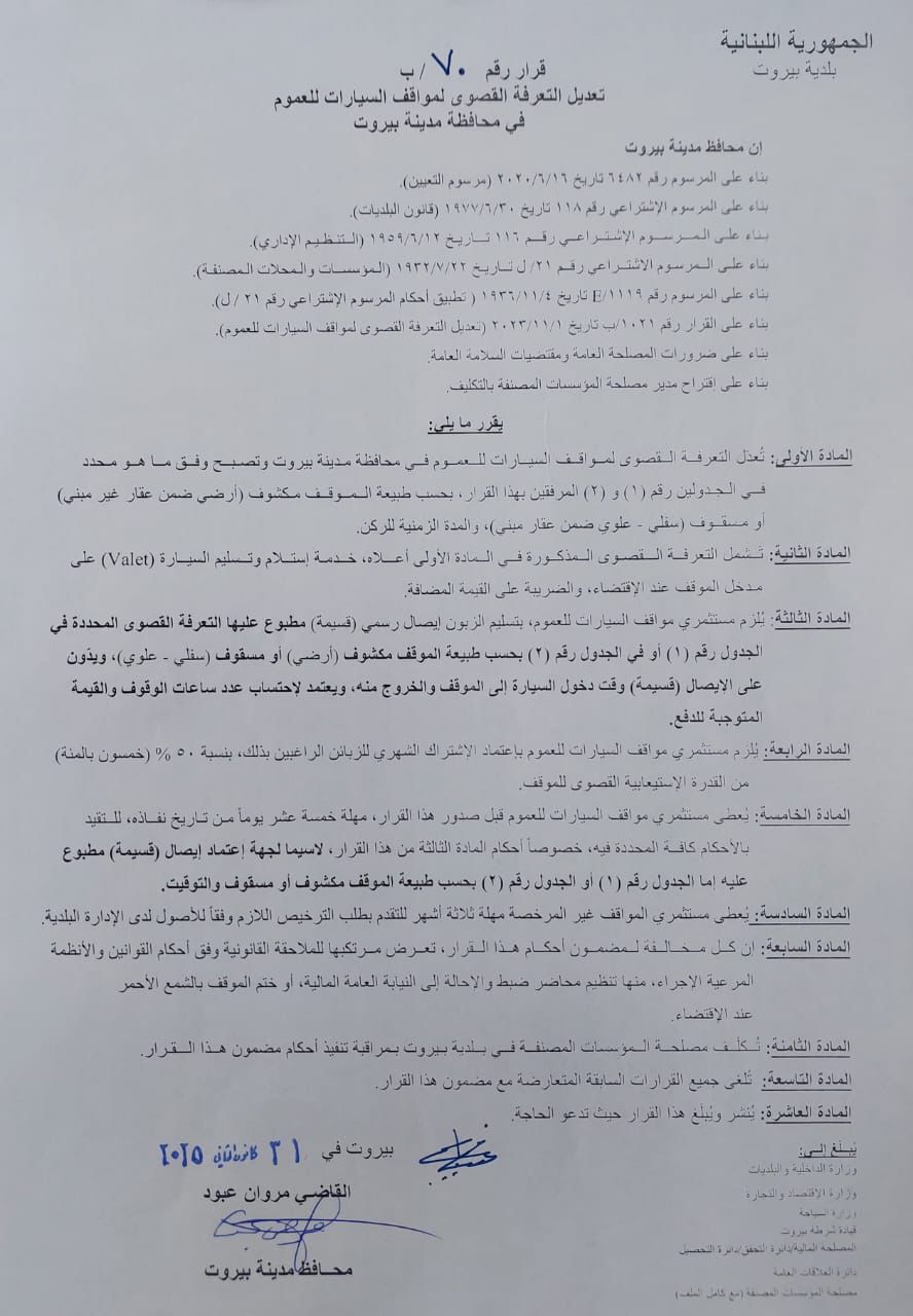 قرار لمحافظ بيروت بتعديل التعرفة القصوى لمواقف السيارات للعموم في المدينة