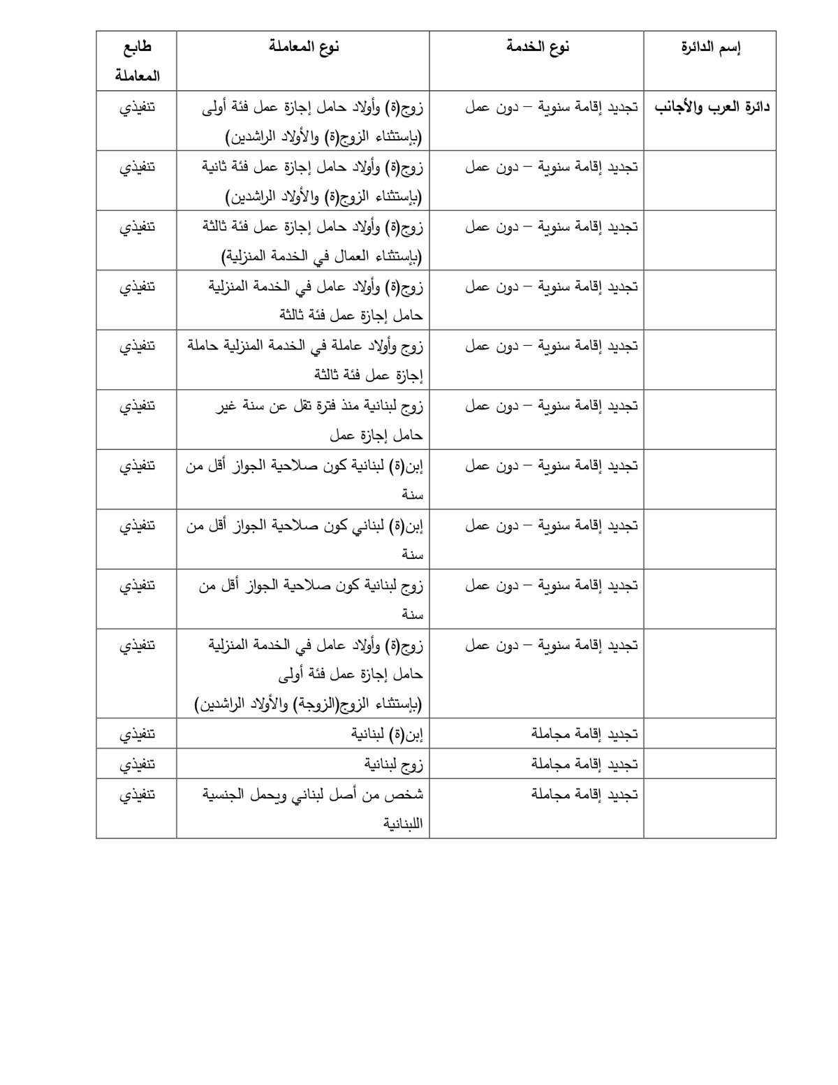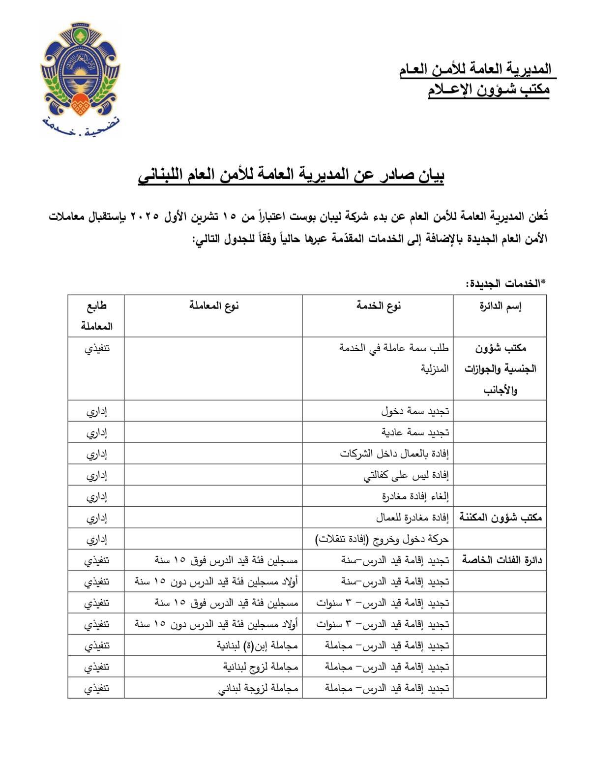أعلنت المديرية العامة للأمن العام عن بدء شركة ليبان بوست اعتباراً من 15 تشرين الأول 2025 بإستقبال معاملات الأمن العام الجديدة بالإضافة إلى الخدمات المقدّمة عبرها حالياً وفقاً للجداول المرفقة أدناه.
