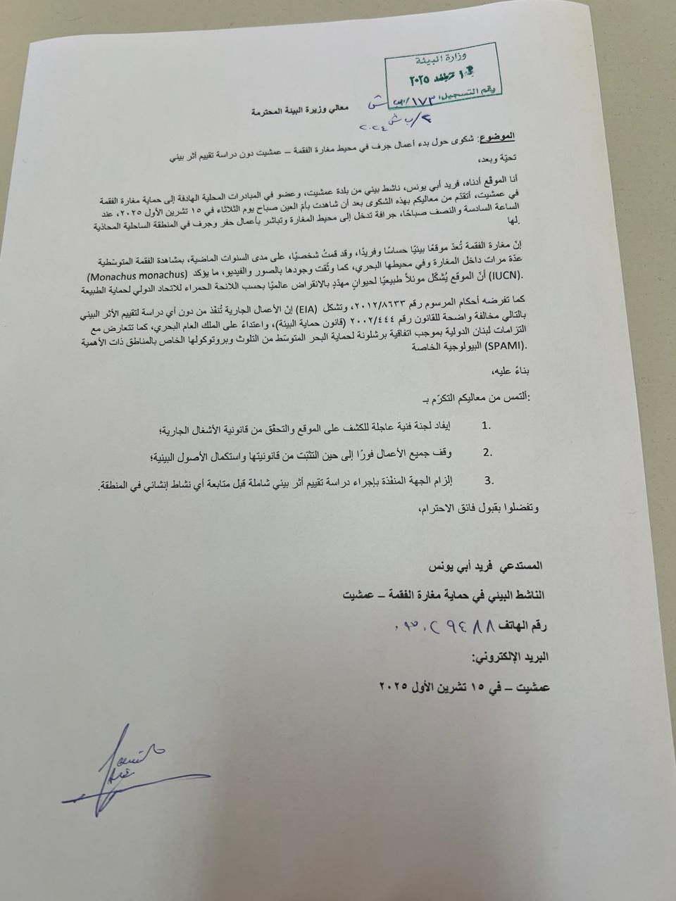 تقدم الناشط البيئي في حماية مغارة الفقمة - عمشيت فريد أبي يونس، بشكوى الى وزيرة البيئة تمارا الزين، بعد أن شاهد صباح اليوم جرافة تدخل الى محيط المغارة وتباشر بأعمال حرف وجرف في المنطقة الساحلية المحاذية لها.