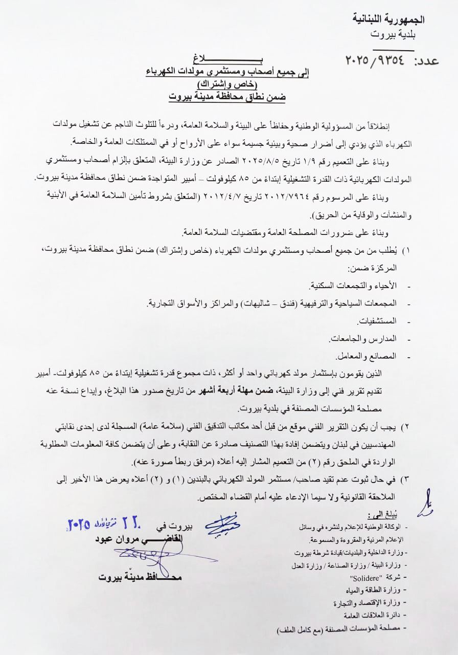 أعلنت دائرة العلاقات العامة في بلدية بيروت في بيان أن "محافظ مدينة بيروت القاضي مروان عبود أصدر بلاغاً إلى جميع أصحاب ومستثمري مولدات الكهرباء (خاص واشتراك) ضمن نطاق محافظة مدينة بيروت تحت رقم 9354/2025 جاء فيه: