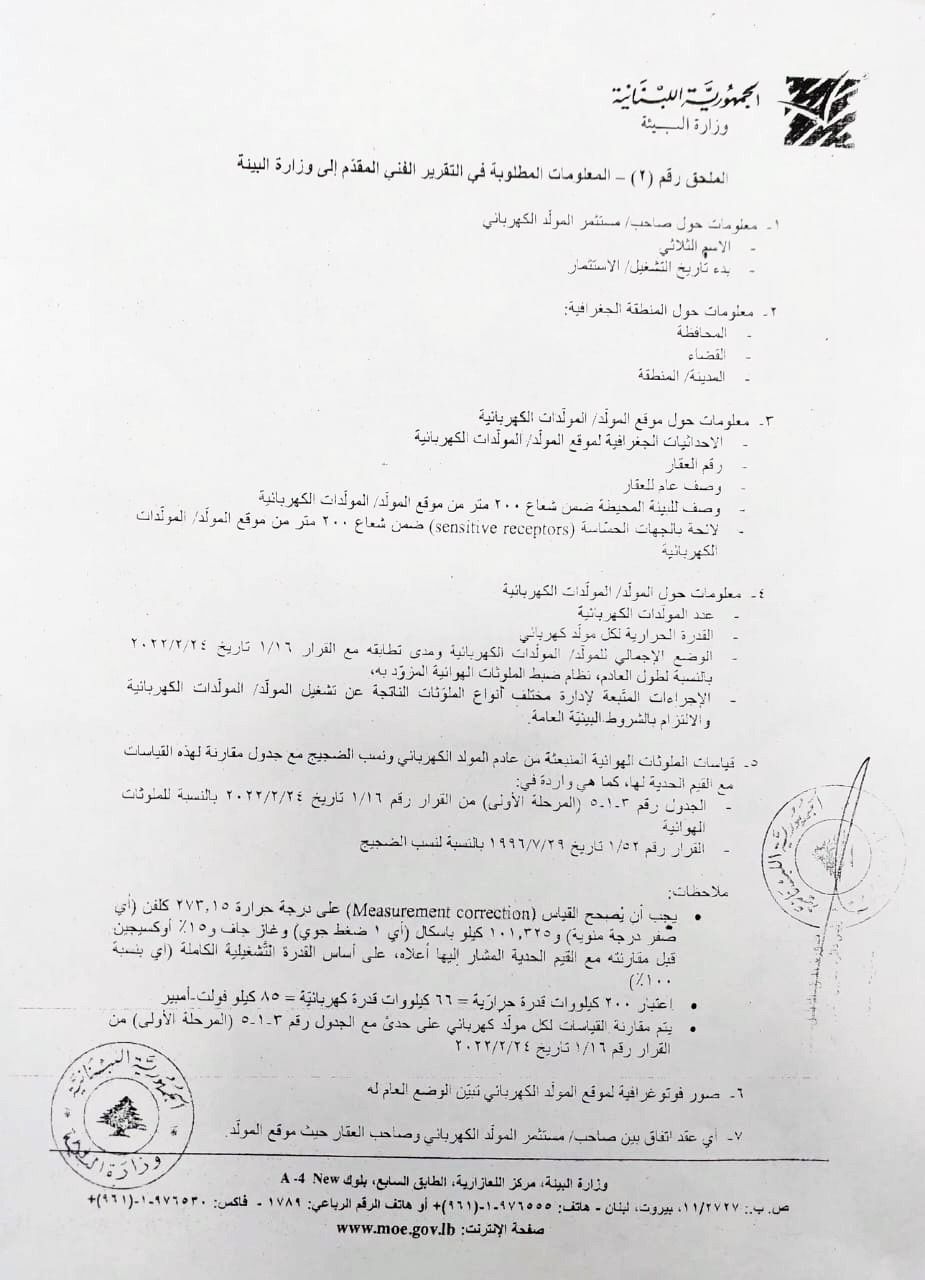 الذين يقومون بإستثمار مولد كهربائي واحد أو أكثر، ذات مجموع قدرة تشغيلية ابتداءً من 85 كيلو فولت- أمبير تقديم تقرير فني إلى وزارة البيئة، ضمن مهلة أربعة أشهر من تاريخ صدور هذا البلاغ، وإيداع نسخة عنه مصلحة المؤسسات المصنفة في بلدية بيروت.