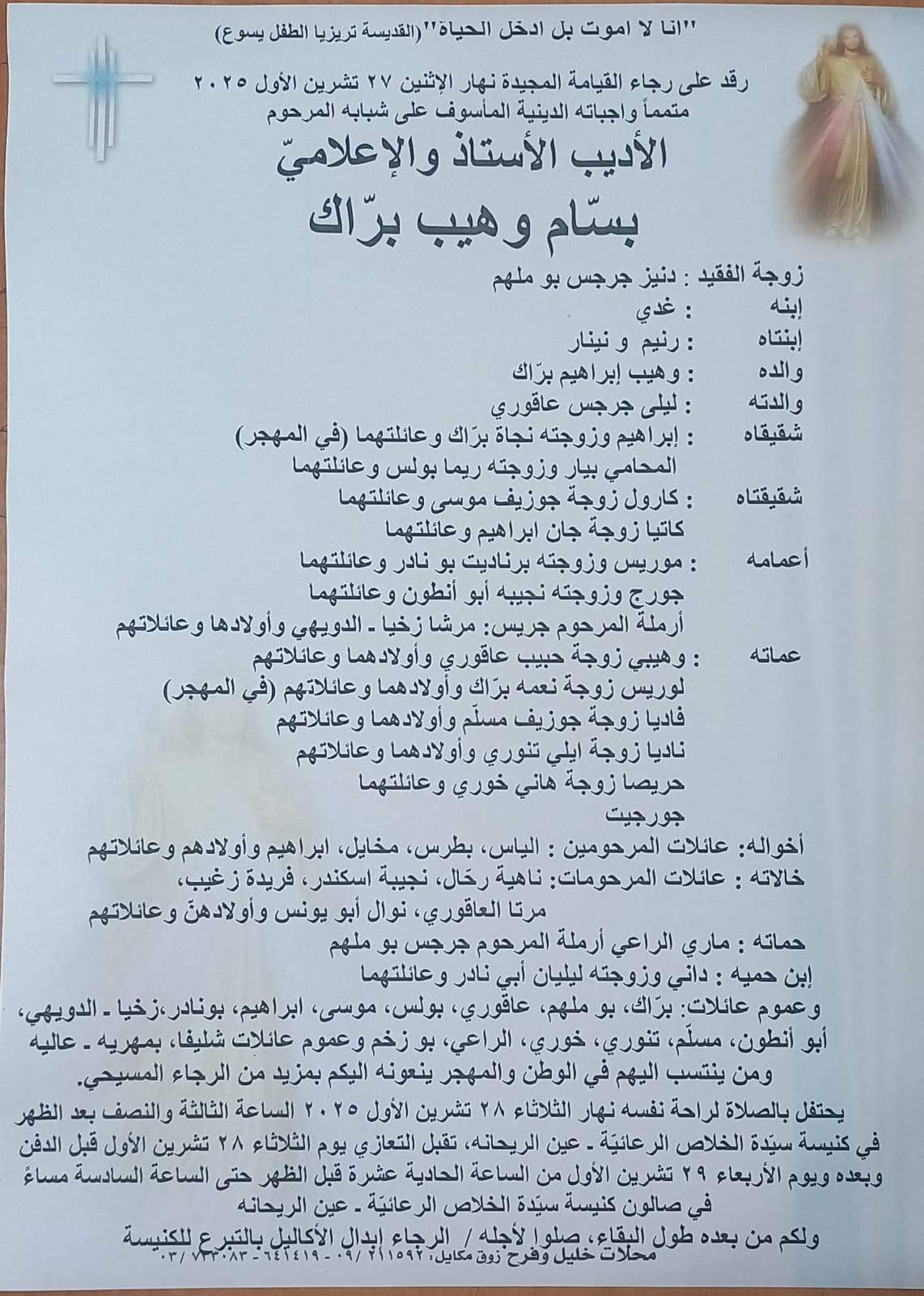 ويحتفل بالصلاة لراحة نفسه نهار الثلاثاء 28 تشرين الأول 2025 الساعة الثالثة والنصف بعد الظهر في كنيسة سيدة الخلاص الرعائية-عين الريحانه.