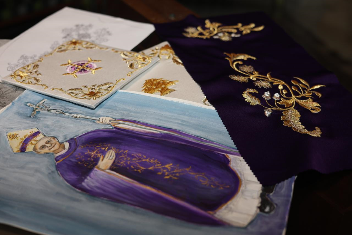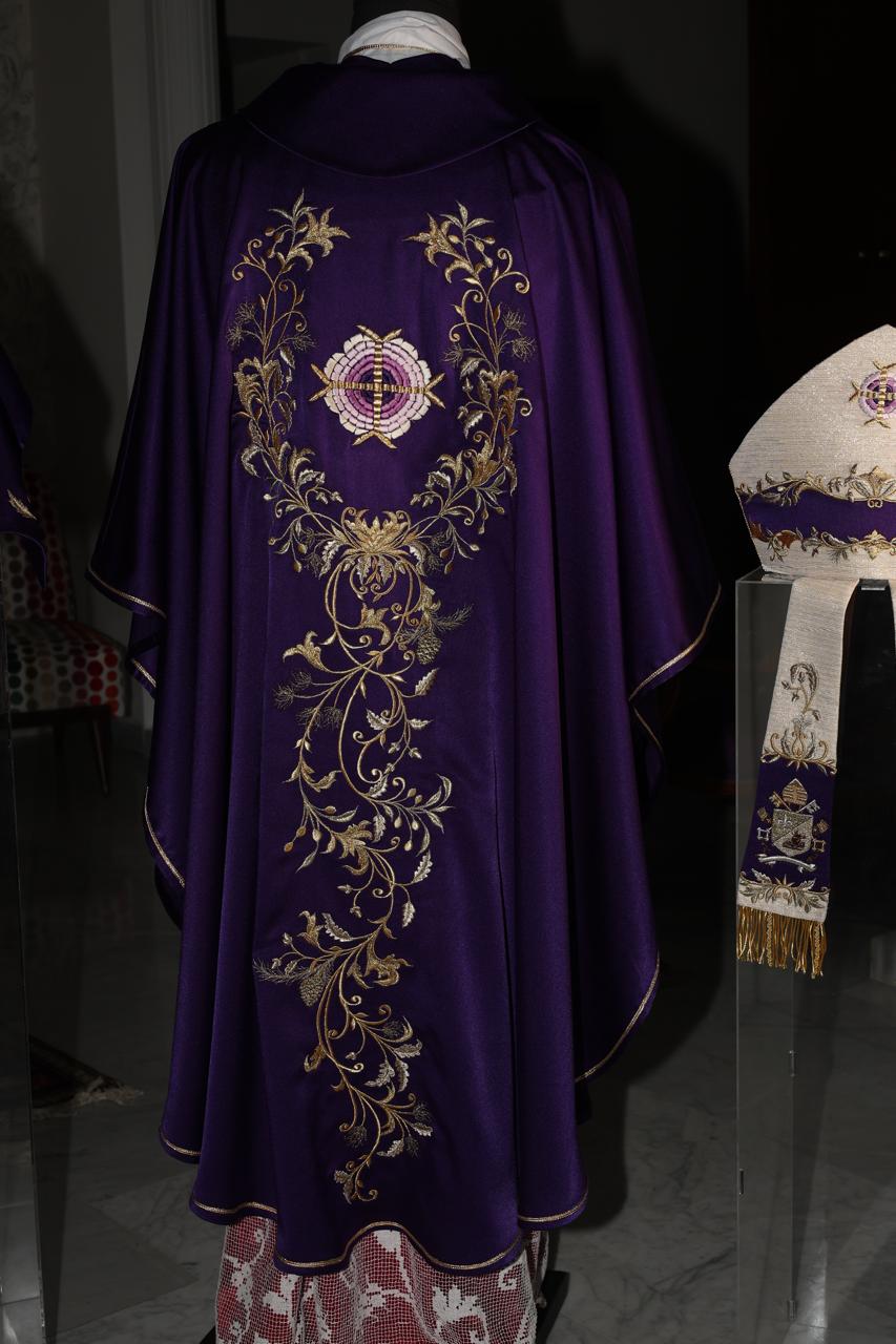 وفي القداس الاحتفالي في بيروت، سيرتدي البابا ثوباً ليتورجياً بنفسجياً، تتوسطه زخرفة صليب من الموزاييك مستوحاة من الفن البيزنطي والسرياني في القرون المسيحية الأولى، وتحيط به أغصان الأرز والزيتون والسنديان: