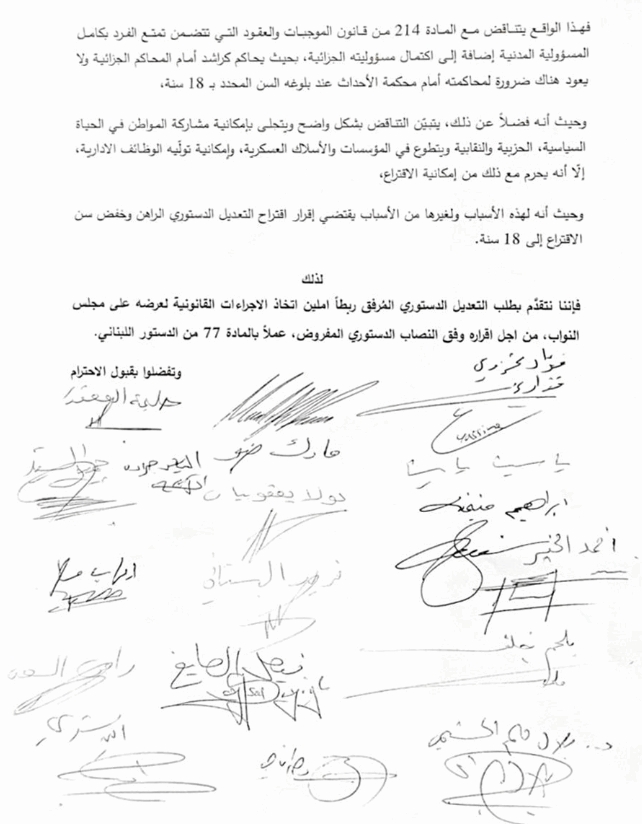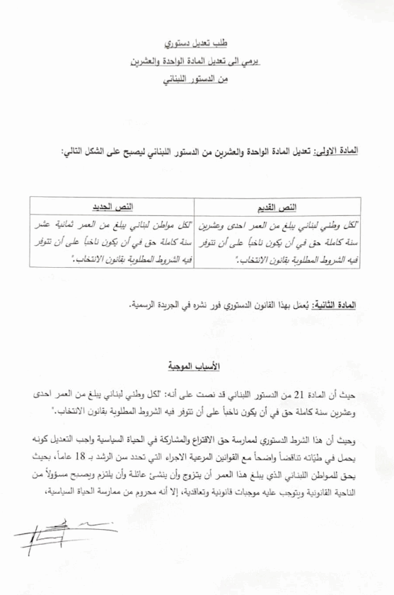 وقّع عدد من النواب اقتراح قانون لتعديل المادة 21 من الدستور اللبناني، يهدف إلى خفض سن الاقتراع ومنح حق التصويت لكل من أتمّ 18 عامًا وتوافرت فيه الشروط المنصوص عليها في قانون الانتخاب.