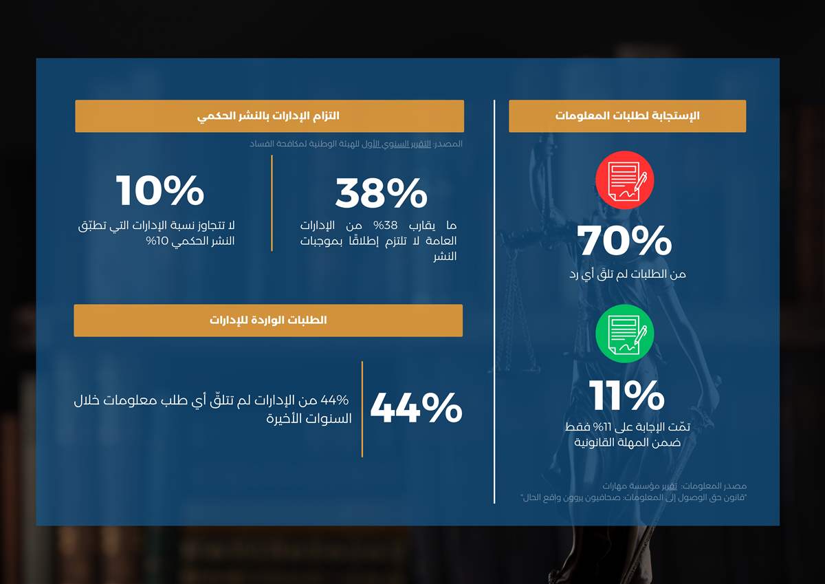 على الرغم من صدور قانون حق الوصول إلى المعلومات عام 2017 وتعديله عام 2021، لا يزال تنفيذه يواجه عراقيل تحدّ من فعاليته. فالمواطن والصحافي يصطدمان يوميًا بصعوبات في الحصول على البيانات المطلوبة، ما يجعل النشر الحكمي الذي ألزم به القانون الإدارات العامة، المسار الأكثر واقعية للحدّ من العراقيل وتسهيل الوصول إلى المعلومات.
